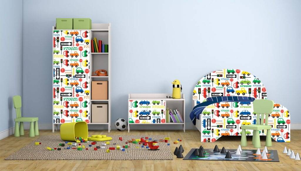 - Детская комната. Часто все стены обрисованы карандашами, а это вытирать и удалять достаточно проблематично, а некоторые даже невозможно. В таком случае самоклейка станет хорошим решением проблемы, она надежно защитит стены и мебель. Если все уже будет разрисовано, можно легко снять пленку и сделать поклеку новой, а стоить это будет мало.