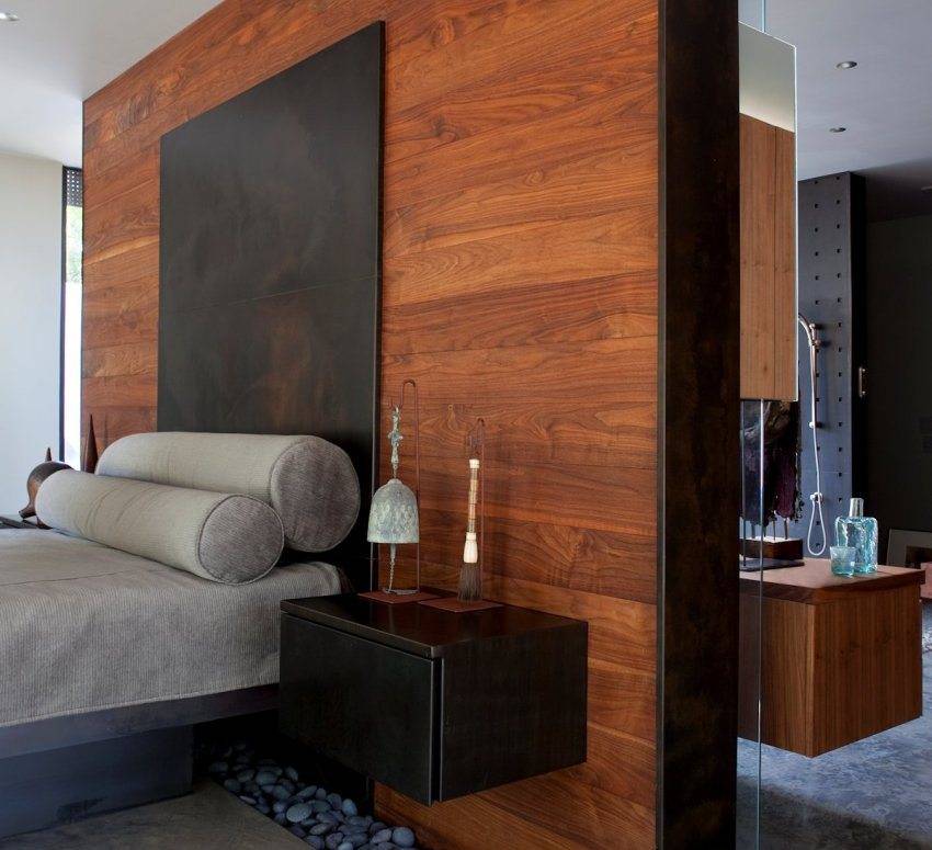 Изголовье, выполненное из ламинированной доски, способствует визуальному увеличению пространства в спальне, а также уравновешивает интерьер. Изголовье может выступать в качестве своеобразной ширмы или зонирующего элемента.