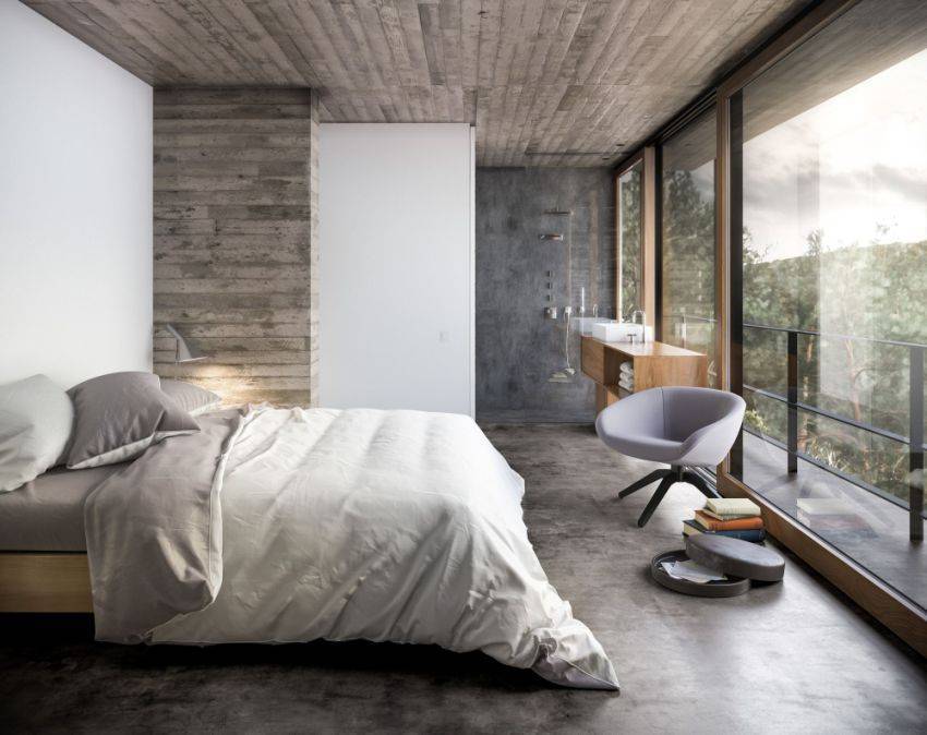 Изголовье, выполненное из ламинированной доски, способствует визуальному увеличению пространства в спальне, а также уравновешивает интерьер