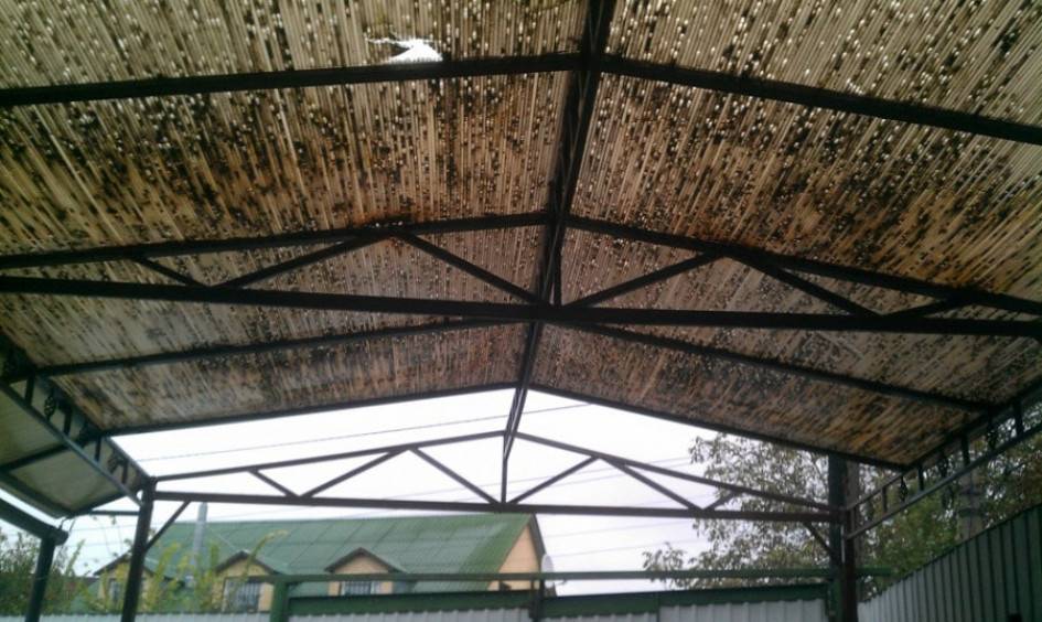 - Поликарбонат как сотового, так и монолитного типа отличается высокими показателями теплоемкости, но низкой теплопроводностью. В итоге из-за скачков температур на элементах металлического каркаса, особенно под точками крепежа и во внутренней части сот, образуется конденсат. Именно поэтому мастеру обязательно нужно тщательно очищать их и время от времени окрашивать.