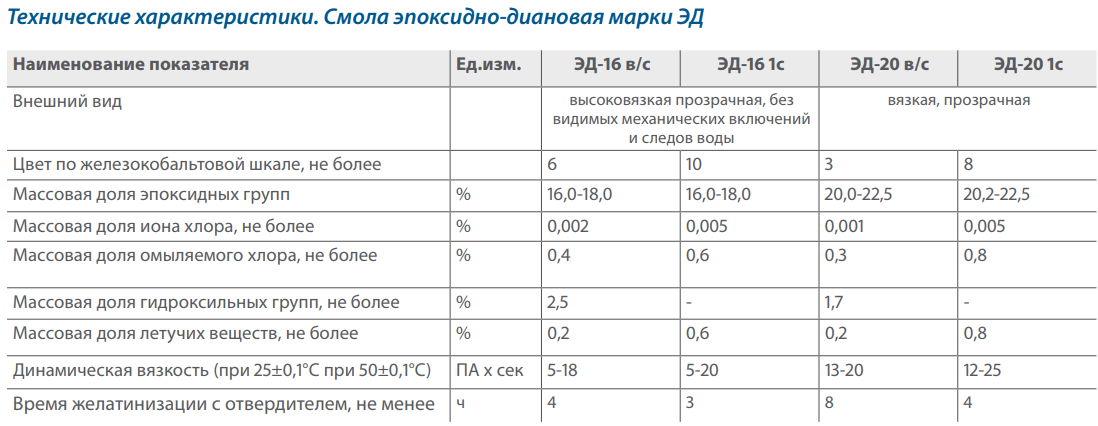В зависимости от вида эпоксидки, полученный клеевой шов будет жестким или эластичным. Технические особенности также разнятся. Как пример можно привести одну из самых популярных марок эпоксидки – ЭД-20. Вот ее характеристики: