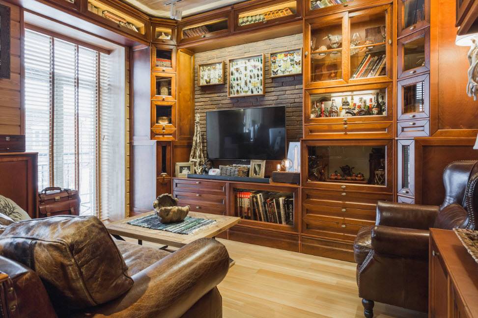 Тем более что та же т.н. деревянная мебель сегодня изготавливается преимущественно из ДСП и МДФ. Эти материалы прекрасно повторяют текстуру и темную расцветку лесного массива. Исключение – маленькая гостиная в стиле Прованс. Она требует пастельно-белую палитру с потертостями.