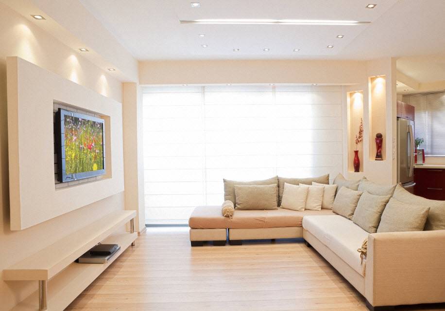 В первую очередь, при оформлении подобной гостиной очень важно сохранять свободное пространство. Поэтому не стоит увлекаться расстановкой большого количества мебели. Также следует сделать ставку на использование светлых тонов и обилие источников света