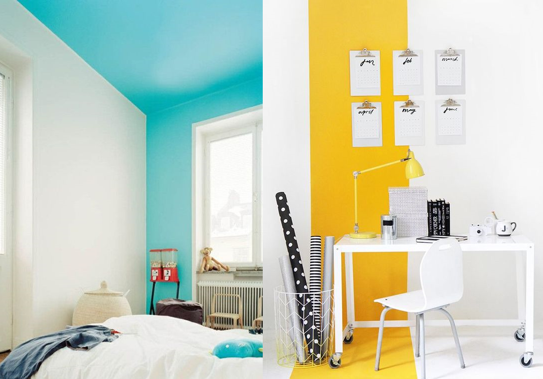 Интересный способ добавить интерьеру цвета, но не перегрузить пространство визуально — скомбинировать нейтральный и акцентный оттенки на стенах. Каждому можно выделить по половине (плюс-минус) стены. Таким образом можно выкрасить все стены комнаты или только одну — акцентную.