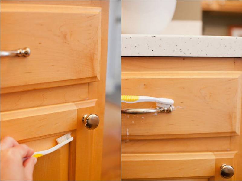 - Чтобы очистить труднодоступные места, щели или декоративную отделку используйте зубную щетку, смоченную в чистящем средстве из нашей статьи. Также узкие щели можно почистить ножом, завёрнутым в ткань.