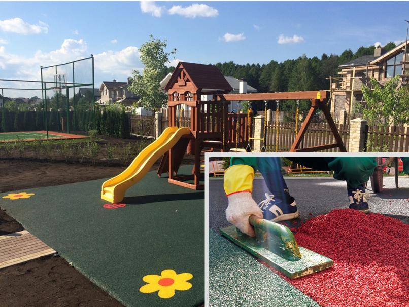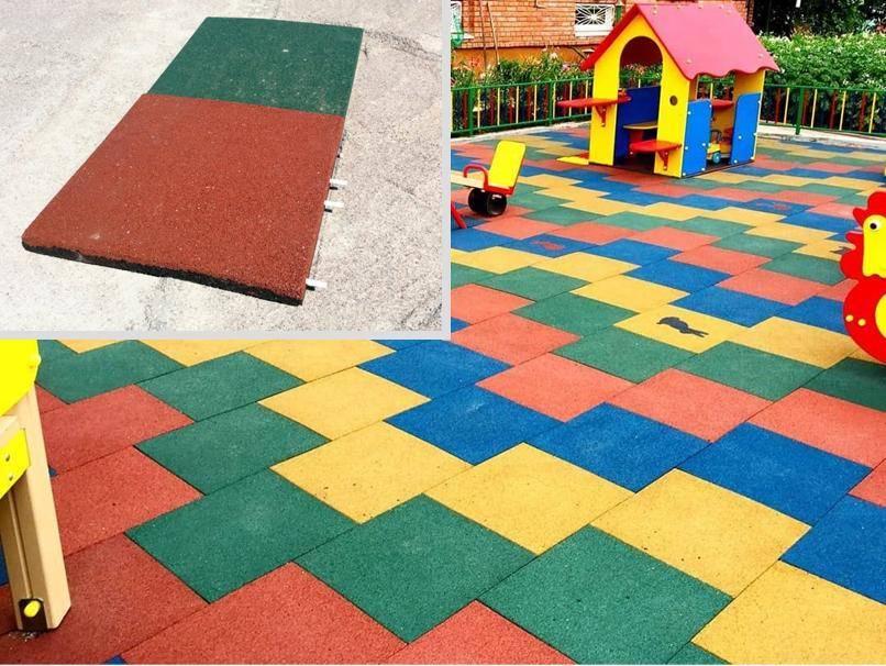 Наиболее травмобезопасный вариант — покрытие из резиновых модулей. Разноцветные элементы помогут украсить детскую площадку, но стоят они немало.