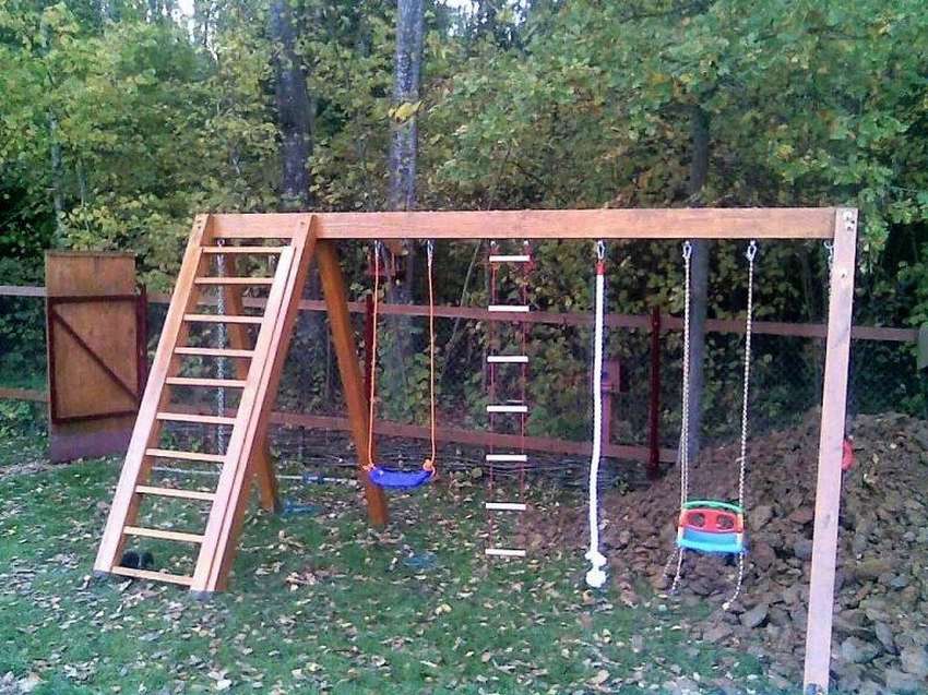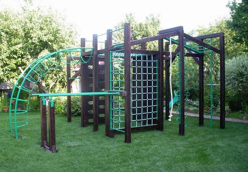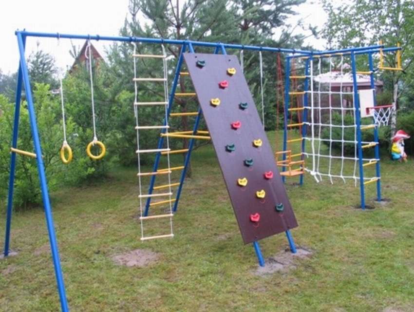Чисто детская спортивная площадка должна состоять из качель, каната и небольшой веревочной лестнице и шведской стенки.