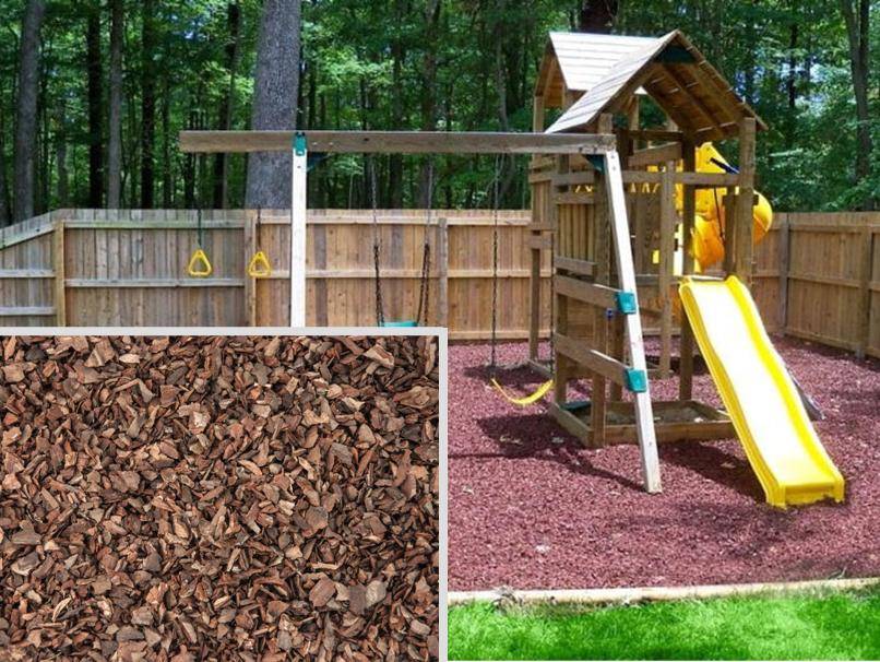 Интересный вариант покрытия — мелко измельченная древесная кора. Экологичный материал актуален для применения в условиях дачи. Засыпанную корой территорию следует ограничить бордюром.