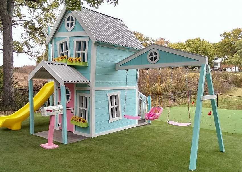 Девочки будут в восторге от двухэтажного домика, выполненного в нежных тонах, с качелями и горкой. Настоящий домик для маленькой принцессы.