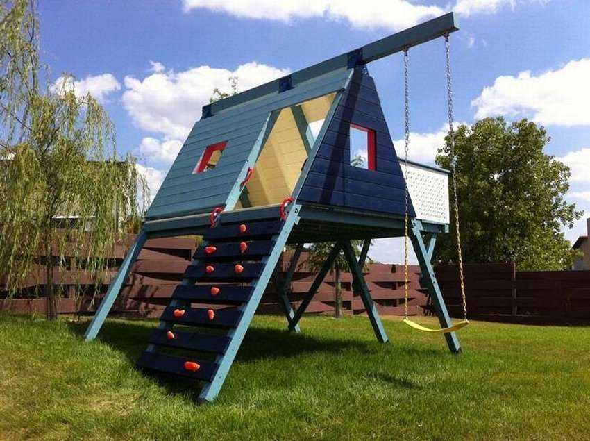 Иногда бывает сложно решить, как сделать детскую площадку на даче, если участок небольшой и на нем не получается разместить все, о чем мечтает ребёнок. Помимо игровых конструкций дети обычно хотят иметь собственный укромный уголок – домик, в котором можно хранить сокровища, прятаться, отдыхать. Но именно он занимает много места.