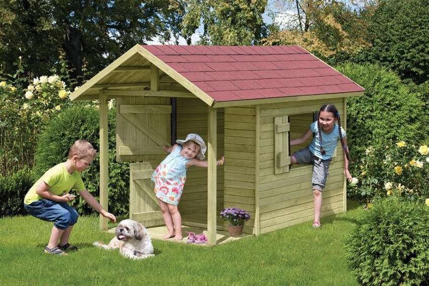 Простенький деревянный дом с настоящими окнами и дверью очень понравится любому ребенку.