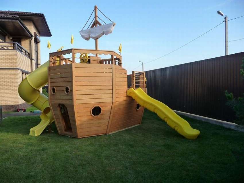 Спортивная площадка в виде корабля. Дети с удовольствием будут его брать на абордаж.