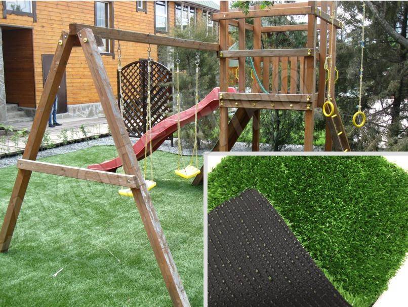 Возможно, Вам будет удобно использовать обычный газон. Покрытие легко выдержит нагрузку, если детей немного, даже если газон не специальный, а, например, спортивный. В приведенном на фото примере ничто не мешает его поливу, а косить траву несложно при небольшом количестве опор постройки.