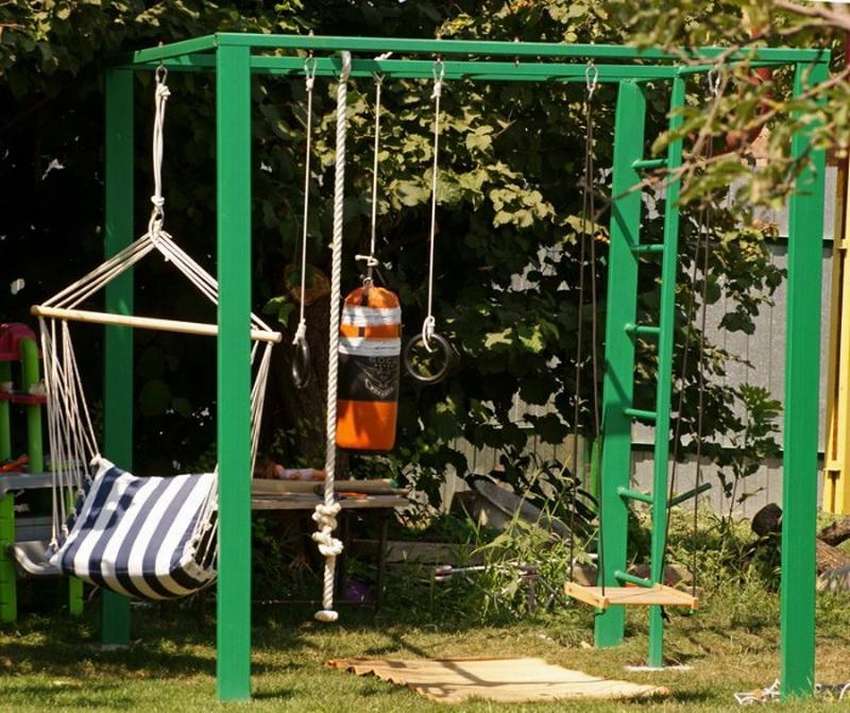 - Спортивный инвентарь. Фигура в форме буквы «П» – универсальный вариант. На планку навешивают канаты, качели, приставляют доски с перекладинами для подъема.