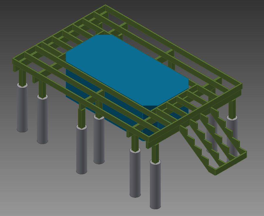 Можно сделать палубу для бассейна на стойках из труб, металлических или асбестоцементных. Такая конструкция будет намного практичнее бетонной, но все равно сделать ее разборной будет достаточно сложно. Кроме того, под такие стойки нужно будет обязательно отсыпать подушки и формировать установочные гильзы. Все это достаточно дорого и не очень практично.