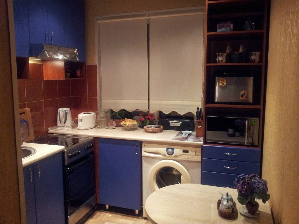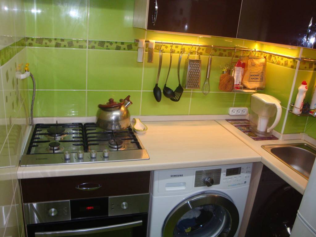 При размещении стиральной машины выбор также не велик. Скорее всего, она займет место одного из напольных шкафов. Чтобы избежать проблем с прокладкой коммуникаций, а затем с расположением дополнительных шлангов и труб, ставить ее целесообразно возле мойки. Если на кухне нет духовки, а установлена компактная варочная поверхность, то стиральную машину можно установить под нее.