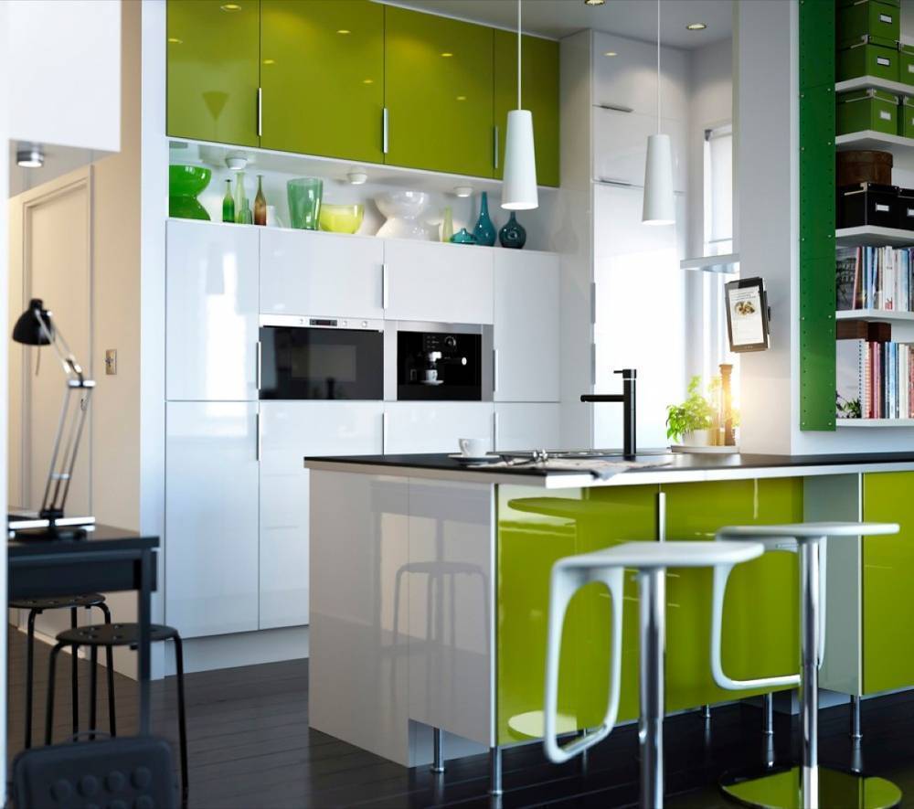 Салатовая глянцевая кухня. Функциональная барная стойка заменяет обеденный стол.