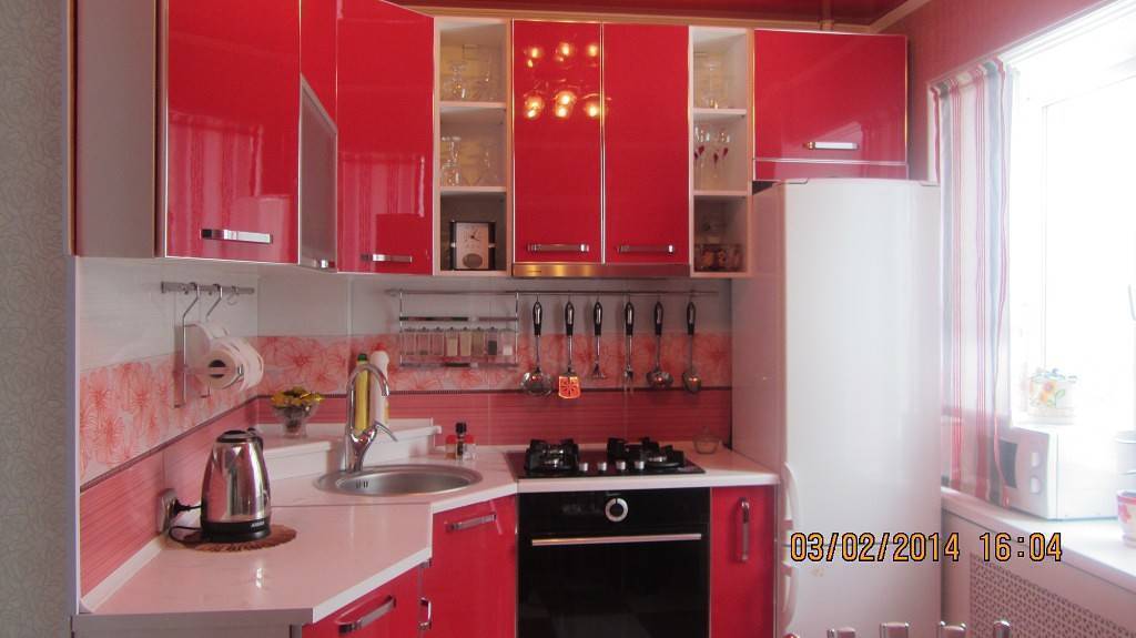 Г-образный гарнитур в красно-белой гамме (Ново-мебель, Новосибирск). На небольшой площади смелое сочетание цветов выглядит достаточно гармонично. Фасады кухни перекликаются с отделкой стен и стеклянным фартуком с фотопечатью.