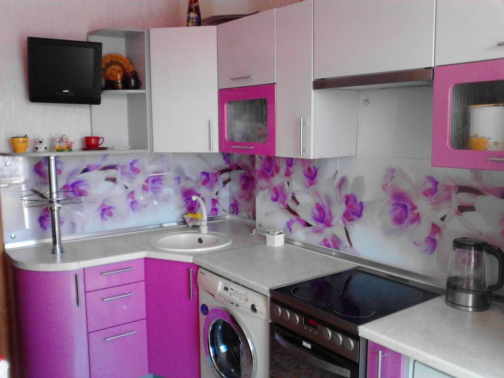 Угловые кухонные гарнитуры – самый оптимальный вариант для малогабаритных помещений в хрущевке. Они располагаются вдоль двух перпендикулярных стен с захватом угла. Подобная планировка сохраняет важный для хозяек принцип эргономичности пространства, при котором мойка, плита и холодильник визуально объединяются в равнобедренный треугольник. Это позволяет облегчить процесс приготовления пищи, поскольку не надо совершать лишних маневров.