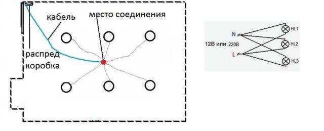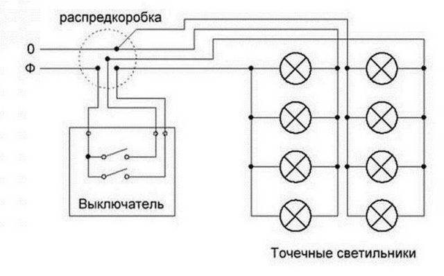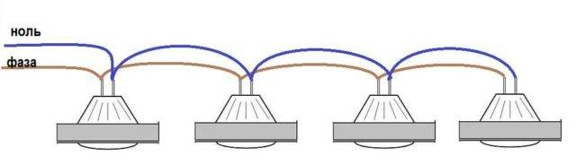 В большинстве случаев используется параллельная схема подключения точечных светильников (ламп). Даже несмотря на то что требуется большое количество проводов. Зато напряжение на все осветительные приборы подается одинаковое, при перегорании не работает одна, все остальные — в работе. Соответственно, никаких проблем с поиском места поломки.