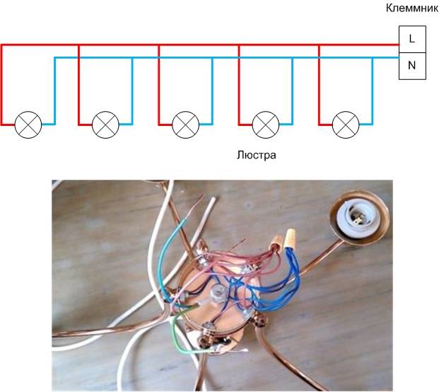 В последнее время люстры соединяются внутри разноцветными проводами. Как правило, используются синие и коричневые проводники, хотя возможны и другие варианты расцветок. Согласно стандартам, синий провод предназначается для подключения «нуля». Поэтому в первую очередь формируется «ноль», за счет скрутки всех синих проводов