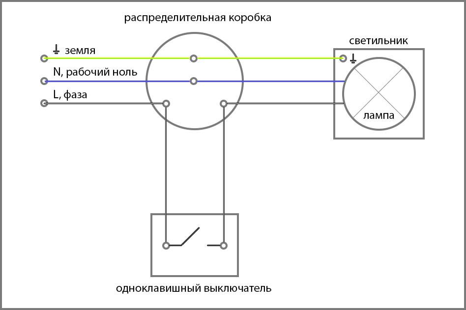 Согласно правил устройства электроустановок предусмотрен порядок подключения выключателя, который замыкает и размыкает цепь посредством разрыва именно фазы. Как это выглядит на схеме? Нулевой провод, минуя выключатель, проложен из распределительной коробки напрямую к нулевому проводу потолочного светильника. Фазный провод из распределительной коробки проходит через клавишу выключателя, которая разрывает цепь.