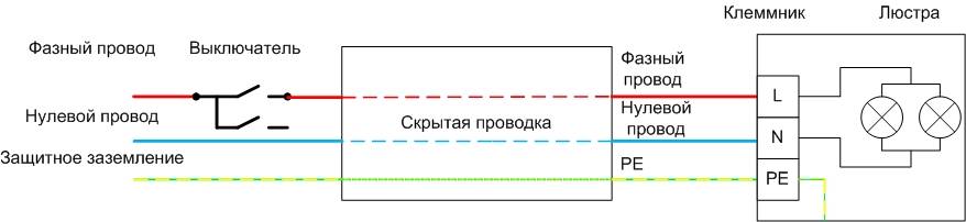 Схема подключения светильника к трем проводам в системе с защитным заземлением.