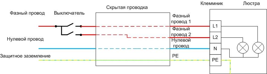 Два остальных провода подключаются к фазному и нулевому проводнику. Как правило, современные люстры обязательно выпускаются с проводом заземления, что связано с требованиями правил техники безопасности.