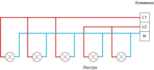 Проводники N элементов многорожковой люстры соединяются между собой, фазные делятся на две связки, которыми можно управлять отдельно.