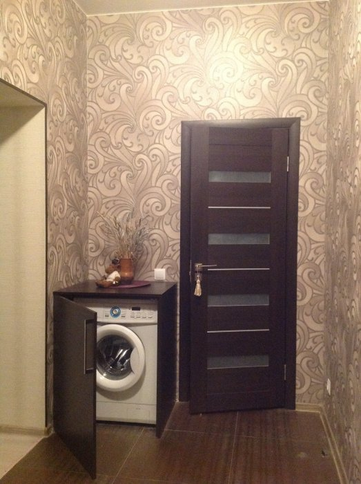 Вариант, изредка использующийся, если потавить стиралку в ванной комнате или кухне по каким-либо причинам не получилось. Монтаж стиральной машины в коридоре возможен, если в нём проходят канализационные и водопроводные трубы, в которые можно врезаться.