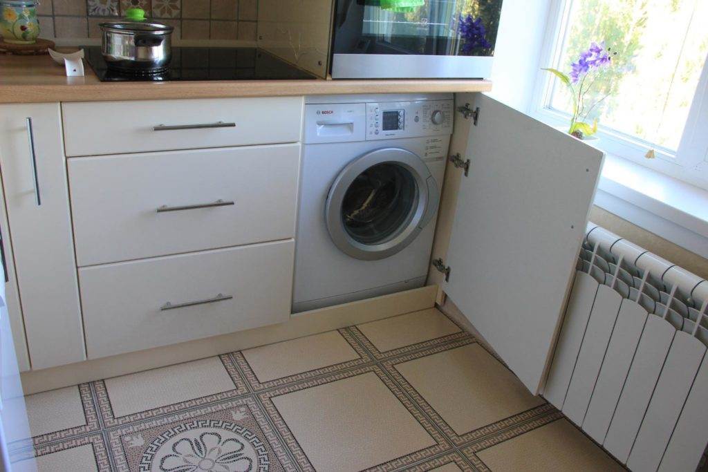 Ещё один популярный вариант расположения машинки-автомата. Здесь также имеются водопровод, канализация, электричество, так что особых проблем с подключением не возникает. Проблемы для размещения аппарата в кухне стандартной квартиры те же, что и ванной – дефицит свободного пространства.