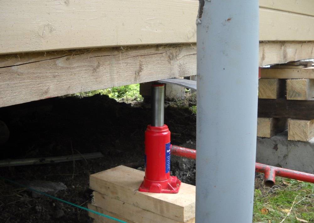 - поставьте домкрат максимально устойчиво, потому что весь дом может «съехать» относительно фундамента;
