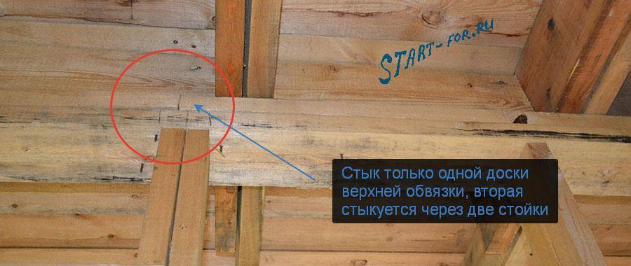 На фото видно, как я выполнял перевязки стен. Для себя необходимо помнить, что стыки обвязок необходимо разнести на расстояние как минимум две стойки.