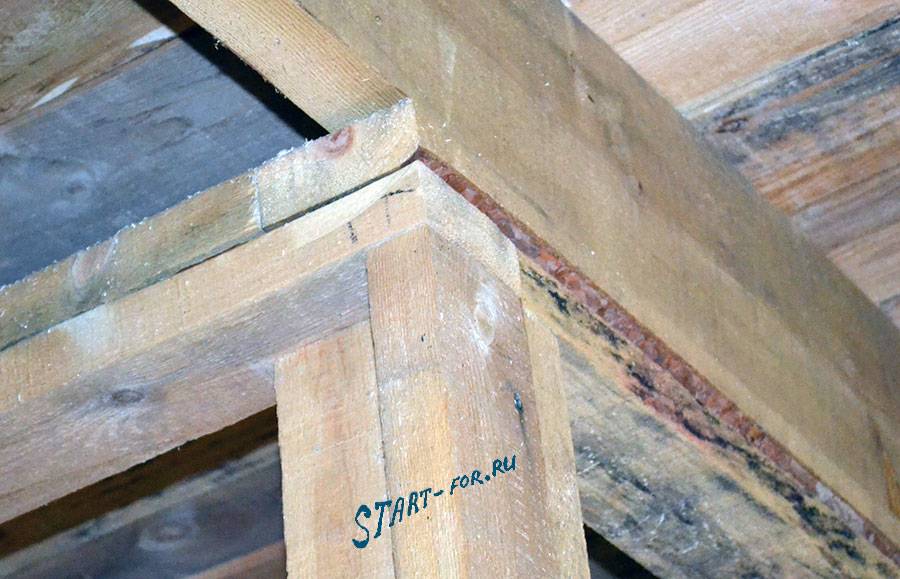 После того, как шаблон приготовлен, по нему надо собрать две пары стропил, которые будут монтироваться по краям. При необходимости ноги наращиваются. Состыковывать их можно вполдерева толстыми болтами или шпильками, что безопасней, или при помощи двух гвоздей, вбитых под разным углом. Между двумя ногами одного стропила надо установить поперечину. После делаются запилы в стропильных ногах в местах примыкания к мауэрлату.