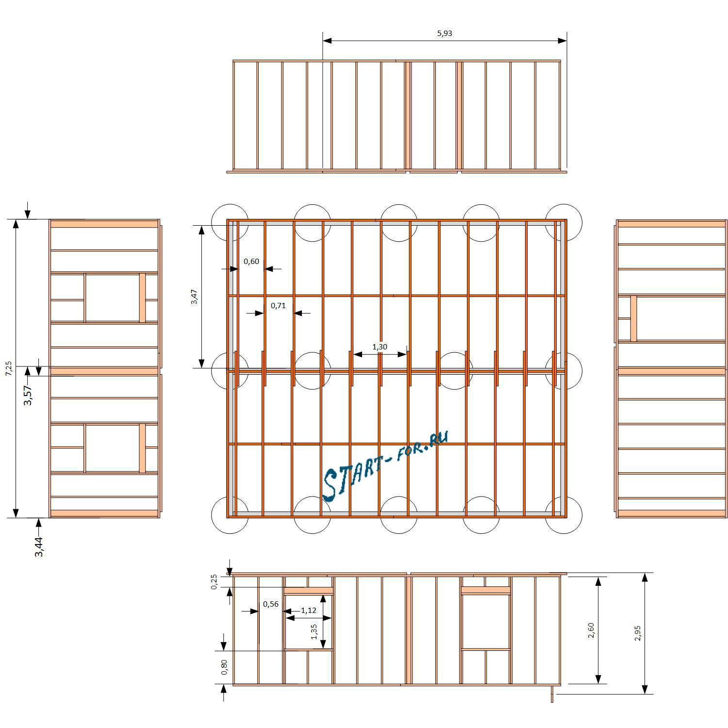 На этом изображении вы видите, как это делал я тут явно видно где у меня будут стойки каркаса. Это поможет вам в дальнейшем, когда вы будете готовить детали дома.