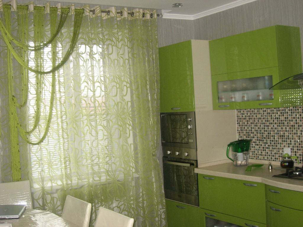 Благодаря многообразию оттенков, зеленые занавески могут как транслировать определенную концептуальную идею, так и просто создавать в помещении спокойную и уютную атмосферу. Они отлично подходят для кухни, благодаря природности цвета. Однако необходимо учитывать общую цветовую гамму помещения, т.к. зеленый не является универсальным колером.