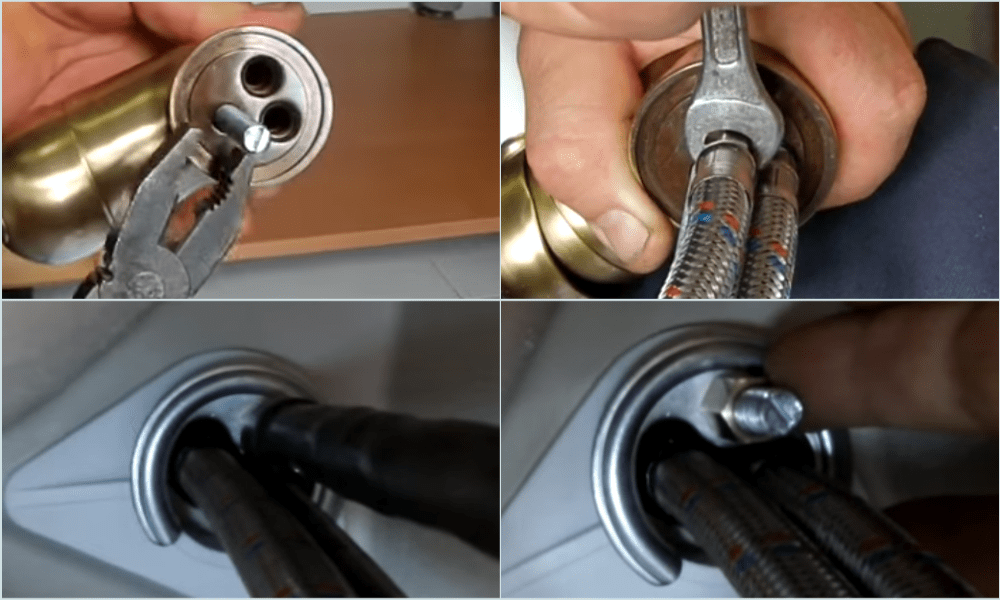 - Отсоединение элементов производится следующим образом: если нужно отвернуть гибкую подводку, то в первую очередь проводится данная операция, если это не требуется, то ослабляются крепежные шпильки либо упорная гайка. Если в конструкции предусмотрен резьбовой штырь, то его отворачивают с помощью крестообразной или плоской отвертки.