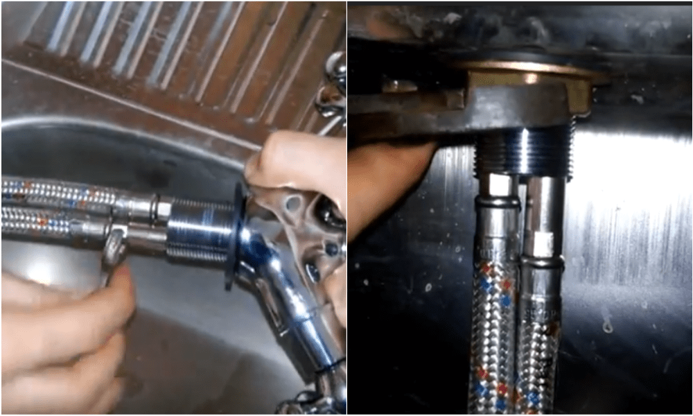 - При конструкции с резьбовыми шпильками поступают аналогично: подсоединяют к корпусу подводки и шпильки, вставляют его в мойку и прижимают гайками через металлическую пластину с резиновой прокладкой.