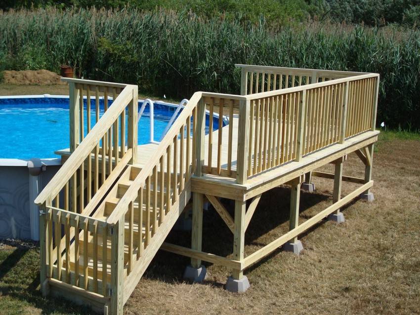 Сооружаем лестницу для бассейна. Для каркасного типа подойдет двухсторонняя, она позволит подняться, а потом и спуститься в воду.
