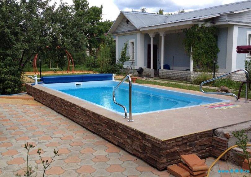 - Допускается снаружи облицевать бассейн различными материалами: древо, пластиковые панели, фанера, натуральный или искусственный камень.