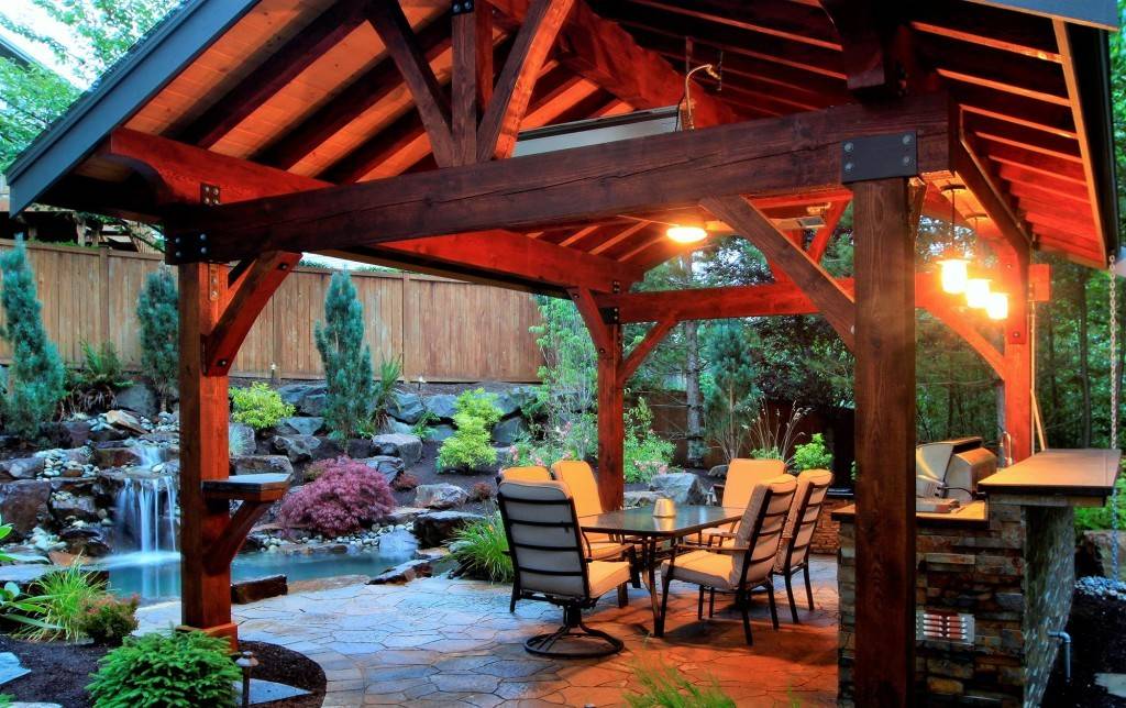 Дерево является теплым и эстетически привлекательным материалом. Такие беседки возводят из оцилиндрованного бревна и клееного бруса. Однако массив со временем разрушается, нуждается в обработке от грызунов и насекомых, регулярной покраске или лакировке. Кроме того, древесина пожароопасна, поэтому обустройство мангала в такой беседке требует принятия мер по предупреждению возгорания.