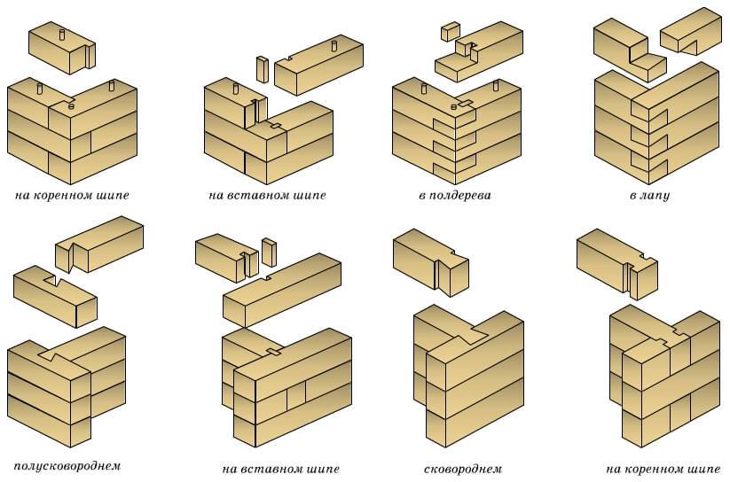 Если же вы делаете гараж из обычного сруба, то необходимо самостоятельно проделать нужные вырубки. Рекомендуется придерживаться типа «в полдерева» или «в лапу» — это наиболее проверенные и надёжные типы соединения. Определившись с типом, выполните черновую сборку сруба, согласно шаблону. Сделайте все необходимые запилы и отверстия, пронумеруйте брус для более удобной сборки после обработки специальными средствами.