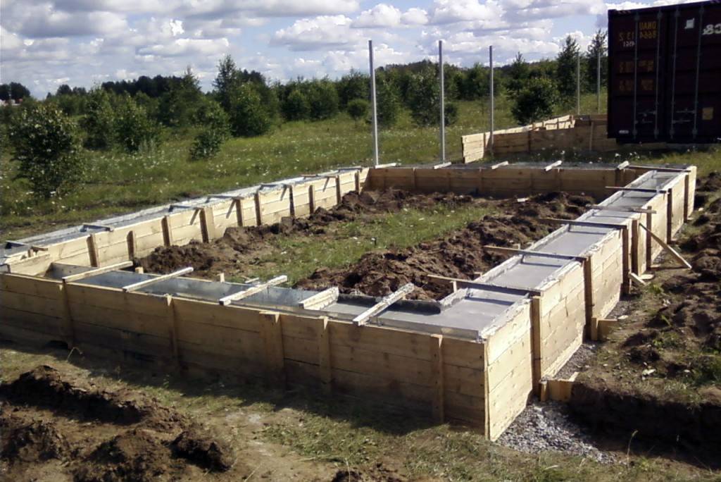 Он отличается от ленточного фундамента установкой в траншеи свай из бетона, можно в качестве свай использовать асбестовые трубы. Возможен сплошной фундамент из бетонной плиты, в этом случае он выполняет роль чернового пола.