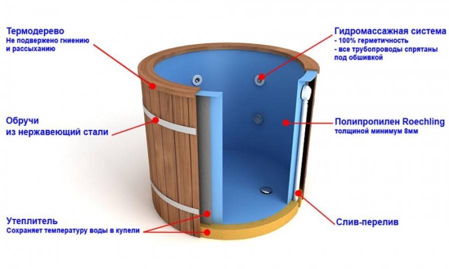 Продавец обязательно спросит, какой функциональности должно быть изделие. Самые дорогие модели предполагают наличие не только лавочек внутри и ступенек, но и системы слива воды, отопительных элементов, гидромассажа.