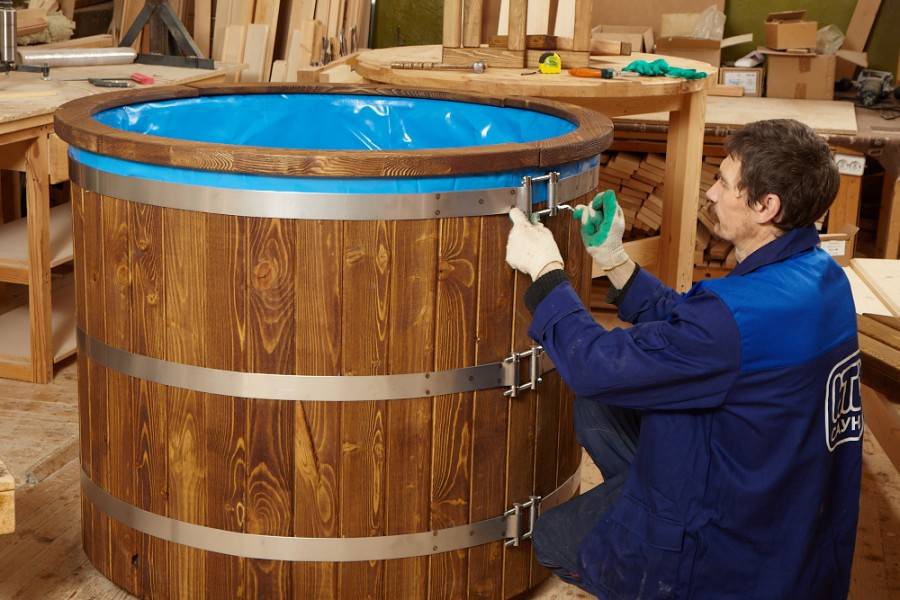 По краям донной части устанавливаются короткие бруски-ножки. С одного края просверливается отверстие для стока воды, в него устанавливается сифон со шлангом. Дно поднимается на рабочий стол для удобства монтажа стенок. Доски вставляются вплотную, так, чтобы выступы идеально входили в пазы. Собранную купель стягивают металлическими полосами, в специальные ушки по краям вставляются болты и плотно затягиваются гайками. Для прочной купели нужно не менее 3 полос.