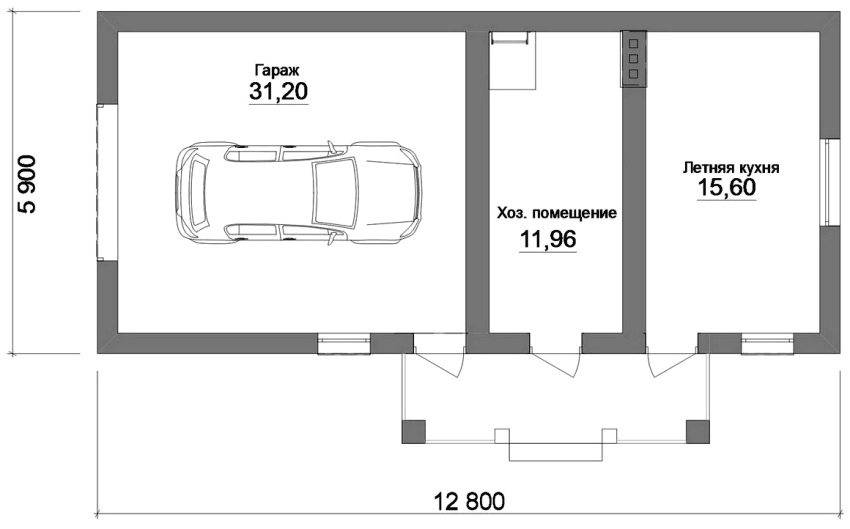 Проект комбинированной дачной постройки с летней кухней, гаражом и подсобным помещением