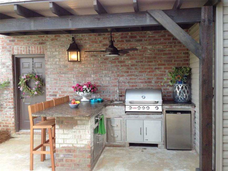 Этот проект можно назвать самым функциональным и практичным. На территории такой кухни обычно устанавливают мангал, барбекю или камин. Здесь будет удобно проводить время с друзьями и близкими, проводить обработку собранного урожая и многое другое.