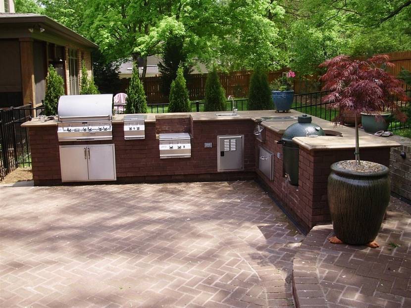Открытая летняя кухня своими руками за счет отсутствия стен, позволяет визуально создать эффект свободы. Основными элементами открытой кухни выступают плита, мойка для посуды и кухонная мебель.