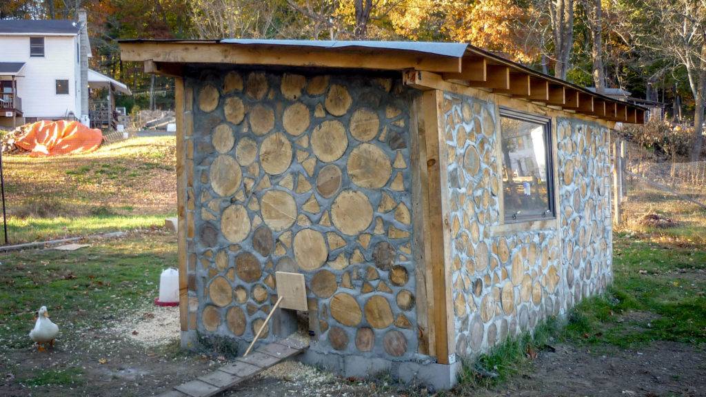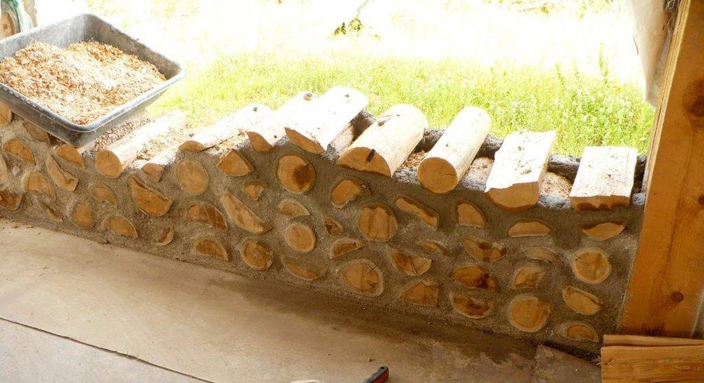 Поэтому, постройка из данных пород дерева, простоит очень долго. Кроме этого, стволы деревьев нарезанные кусками пол метра, позволят удерживать необходимую оптимальную температуру и придают постройке высокую прочность. Нарезанное дерево, укладывается точно так же, как если бы делать поперечную кирпичную кладку, где кирпич, после укладки виден своим торцом.