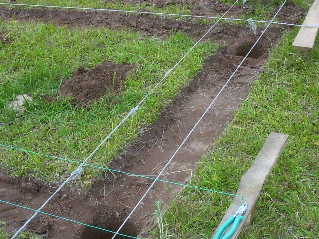 Шаг 1. Первым делом нам потребуется подготовить территорию. Для этого на участке следует провести уборку и прополку от сорной травы. Теперь по всей площадки забиваются металлические стойки и натягиваются веревки. Сделать углубления в почве можно как с помощью бура, так и лопаты. Обычно верхний слой земли снимают на 15-20 сантиметров.